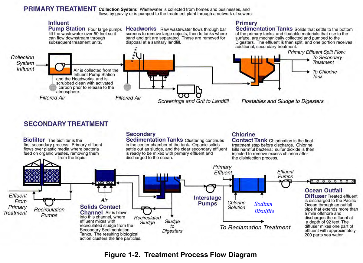 The wastewater is then de-chlorinated with sodium bi-sulfite to protect ocean life. This highly purified wastewater is called "final effluent" and flows through a pipeline 90 feet deep and one mile off-shore where it is diffused into seawater safely into the ocean environment.